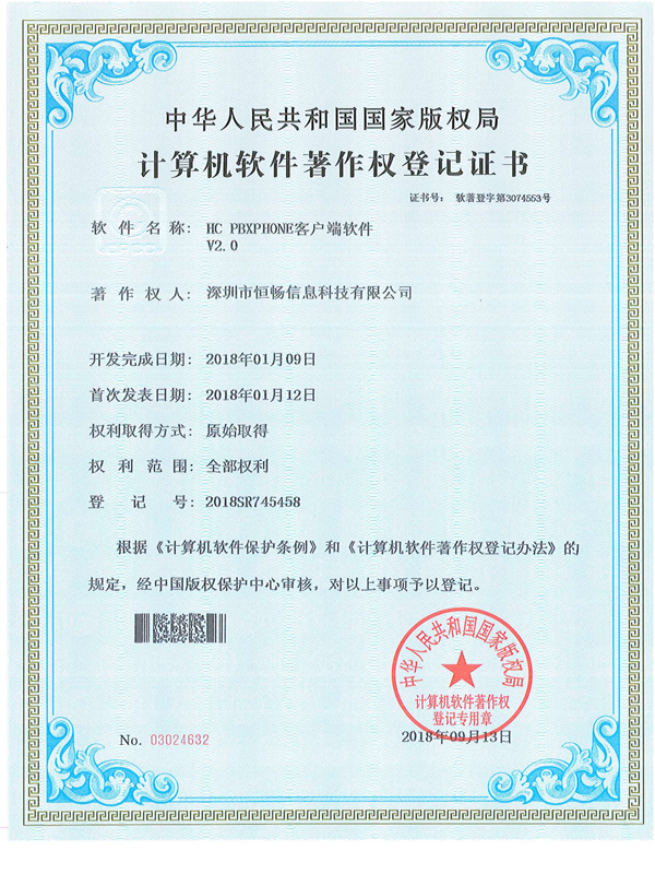 HC通信系统 软件著作证书