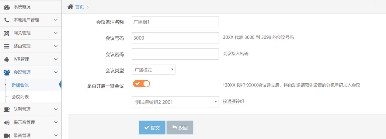 创建一个会议室,设置一个会议室的号码(如:3000),会议室类型选择位“广播模式”,打开会议室的一键会议功能,在下拉框里面选择对应的振铃组,创建完成后点“提交”按钮完成创建。