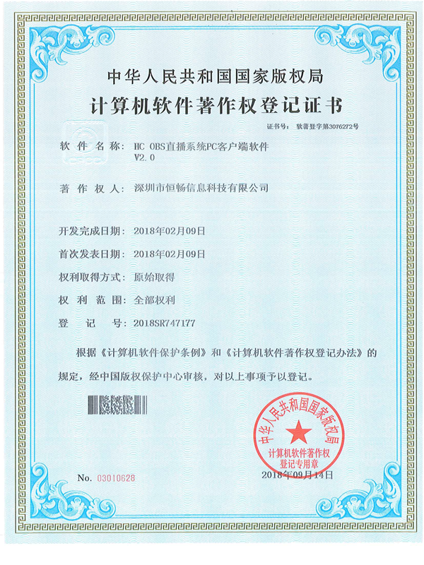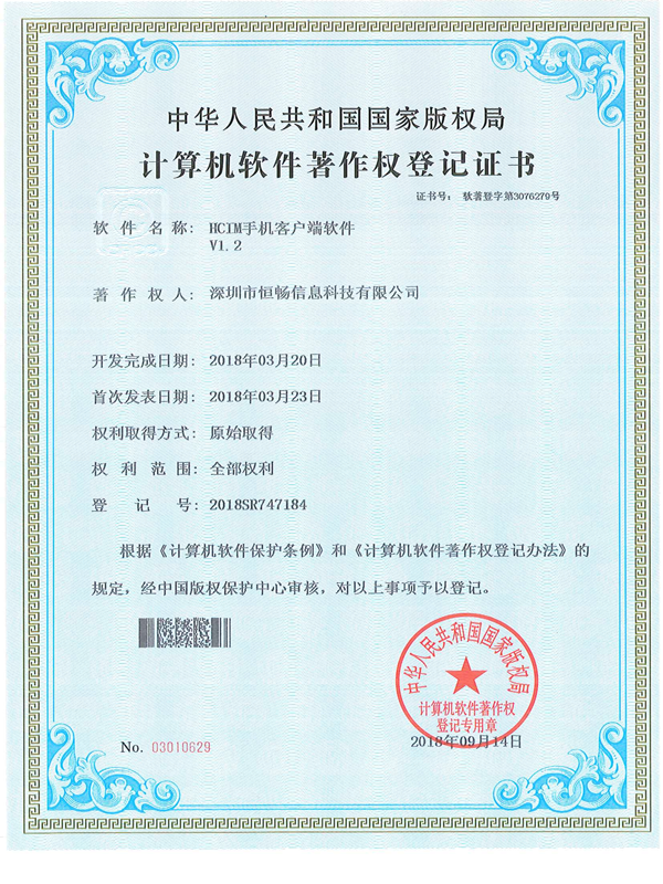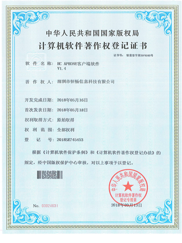 HC通信系统 软件著作证书